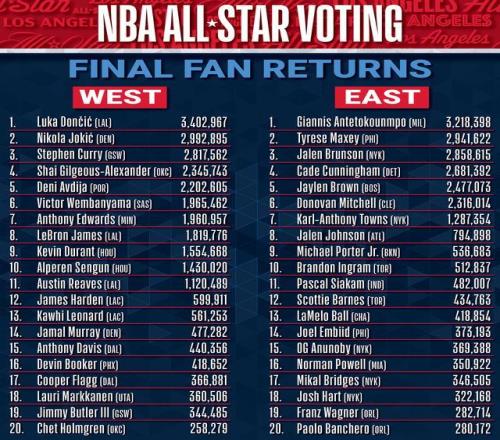3.东契奇生涯第6次入选全明星,他是本次全明星球迷投票的票王。