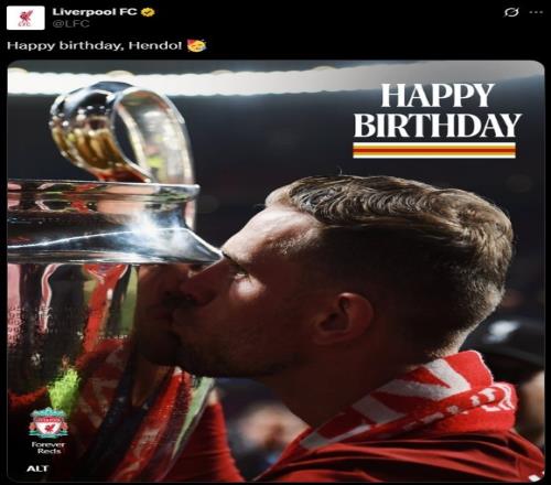 乔丹亨德森今天迎来35岁生日,利物浦&英格兰队送祝福