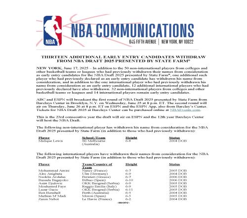 篮球资讯06月18日宣 NBA今日官宣最终提前参选球员名单,最终本届提前参选球员剩余人数46人,包括32名来自NCAA、其他联盟的球员以及14名国际球员,杨瀚森在14名国际球员行列之中!